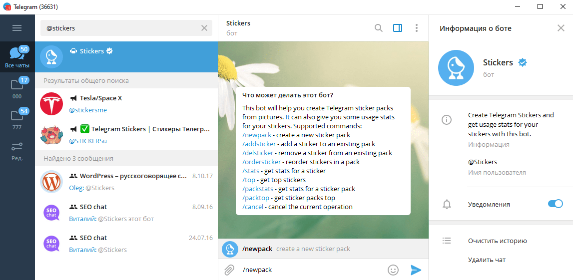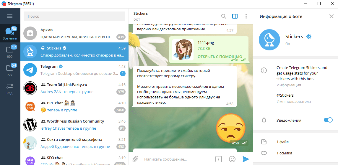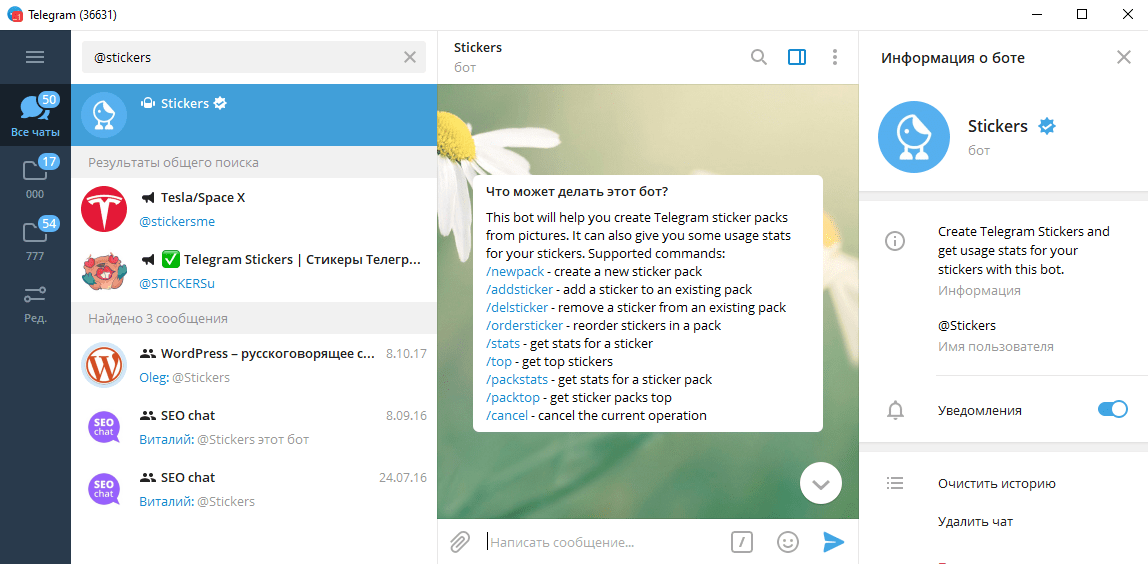 Если у вас появилось желание или потребность добавить свои стикеры в Телеграм, это можно сделать через официального бота @Stikers.