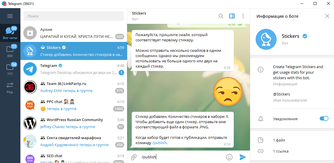 Отправьте /publish и все готово. Вы создали свой первый набор стикеров в Телеграме.