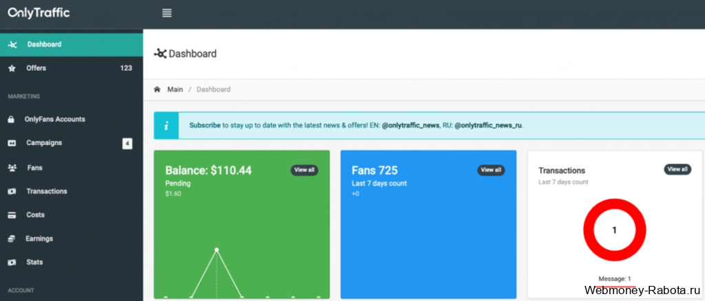 В этом случае, можно задействовать те же социальные сети, но не искать авторов, а лить другой трафик – пользователей, которые будут подписываться и тратить деньги. Этим заниматься намного проще, промо материалы предоставляются, остается только заняться их распространением. Личный кабинет здесь простой и удобный: