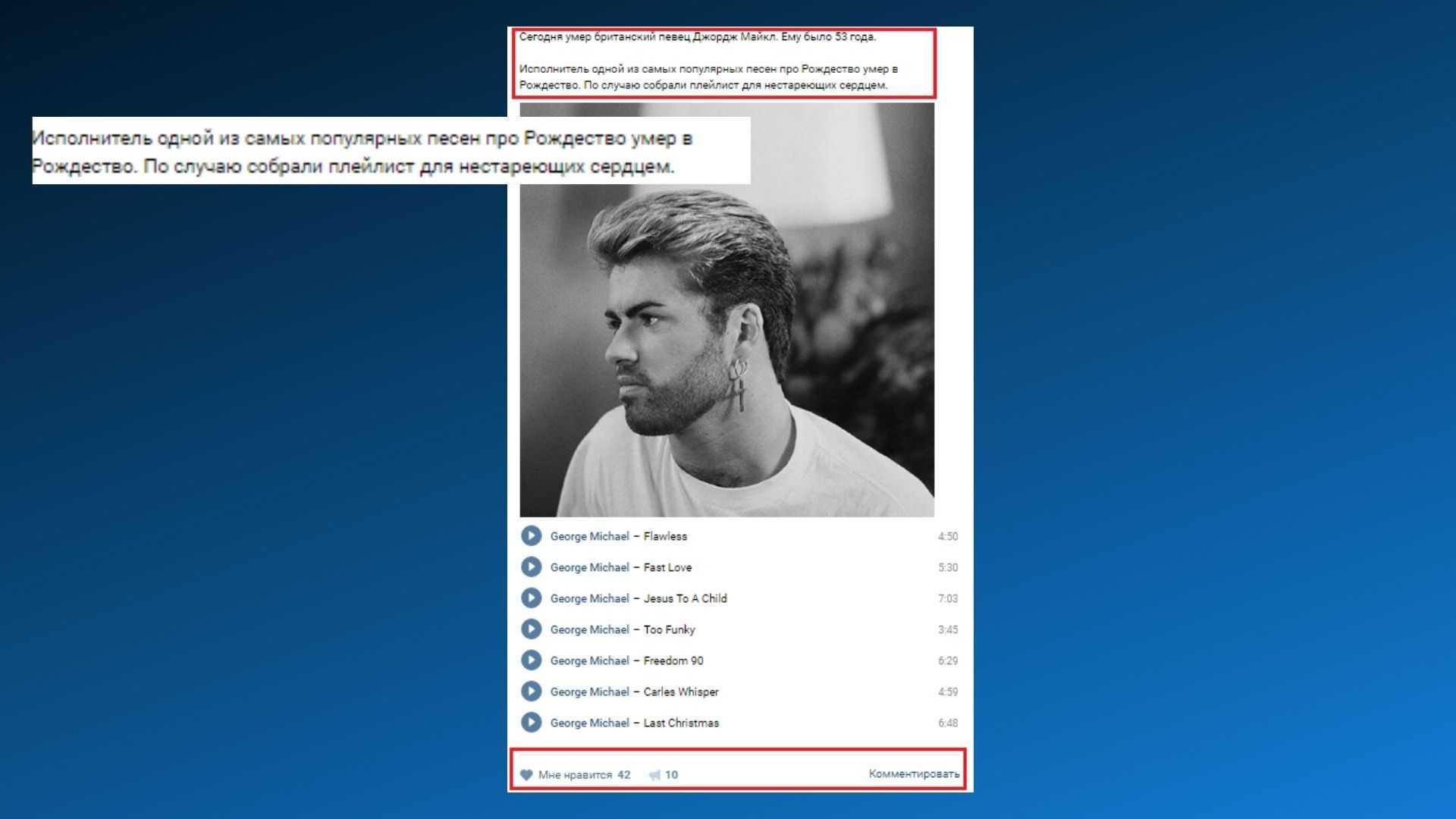 Подумайте, что происходит сейчас? Канун Рождества? Умер какой-то певец? Найдите ответ на вопрос и используйте его в своих целях. Например, я делала подборку песен Джорджа Майкла, когда тот умер. Это было сделано вовремя, а потому аудитория приняла пост хорошо.