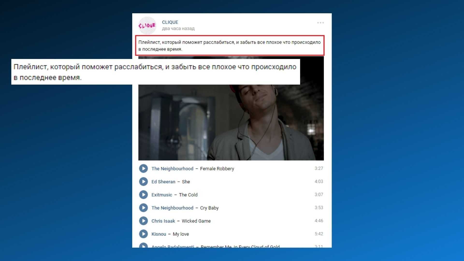 Можно сосредоточиться на какой-то музыкальном стиле. Или, например, посмотреть, как хорошо делает сообщество Клик. Они подбирают музыку под настроение: плейлист, который поможет расслабиться и забыть все плохое, что происходило в последнее время. Или плейлист для грустных, для интровертов, для тех, кто опаздывает на пары. Границ нет. Включайте фантазию.