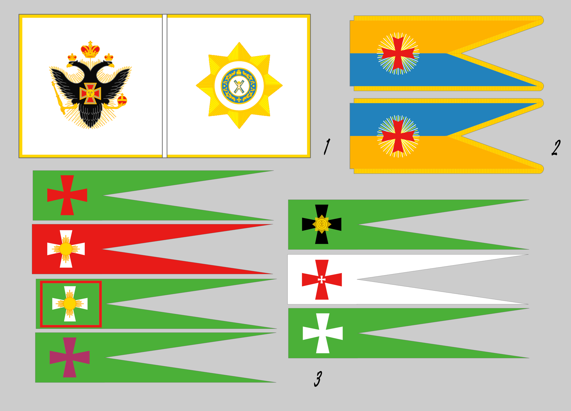 - Флаги Черноморского казачьего войска: военное знамя 1788 года (1), знамёна 1803 года, пожалованные Александром I (2), и куренные значки 1788 года, пожалованные Екатериной II (3)