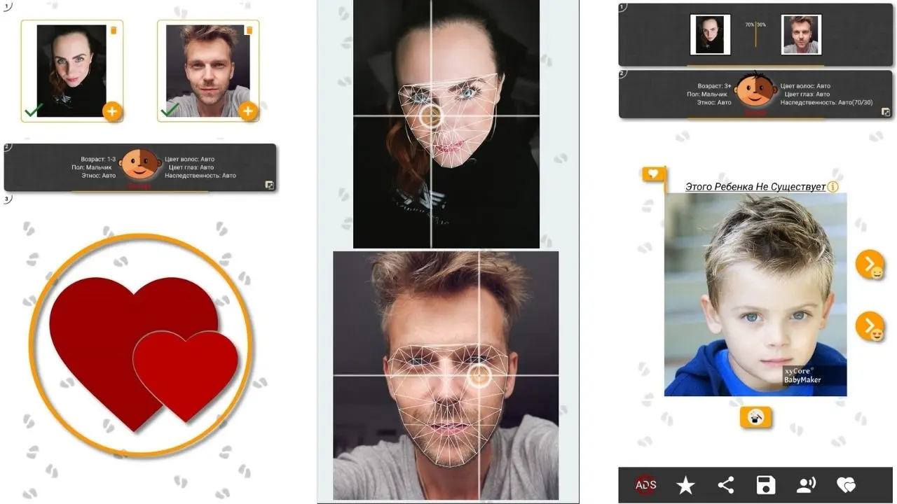 Одно из лучших бесплатных приложений для телефонов Android для составления портрета ребенка по фотографиям мамы с отцом. Разработчики внедрили в BabyMaker новейшие технологии для проведения анализа изображений. Поэтому после загрузки фото можно ожидать впечатляющих результатов. Каждый родитель будет учтен и повлияет на черты внешности, которые получит будущий ребенок.