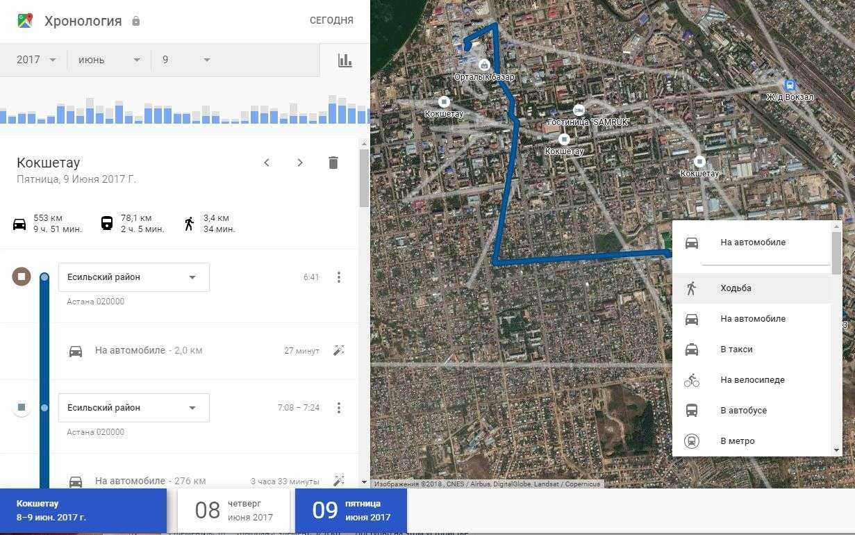 Хронология в Google-картах показывает места, которые вы посещали. Посмотреть, когда вы там были, можно двойным щелчком по отметке. Также в меню, которое находится в верхнем левом углу можно выбрать день, месяц, год, чтобы посмотреть ваш маршрут за этот день, но не ранее того, когда была включена данная функция. С каждым годом сервис улучшается: чем позднее хронология, там больше и точнее в ней информация, вплоть до транспорта, на котором вы передвигались. При необходимости каждую запись можно удалить, кликнув на значок корзины.